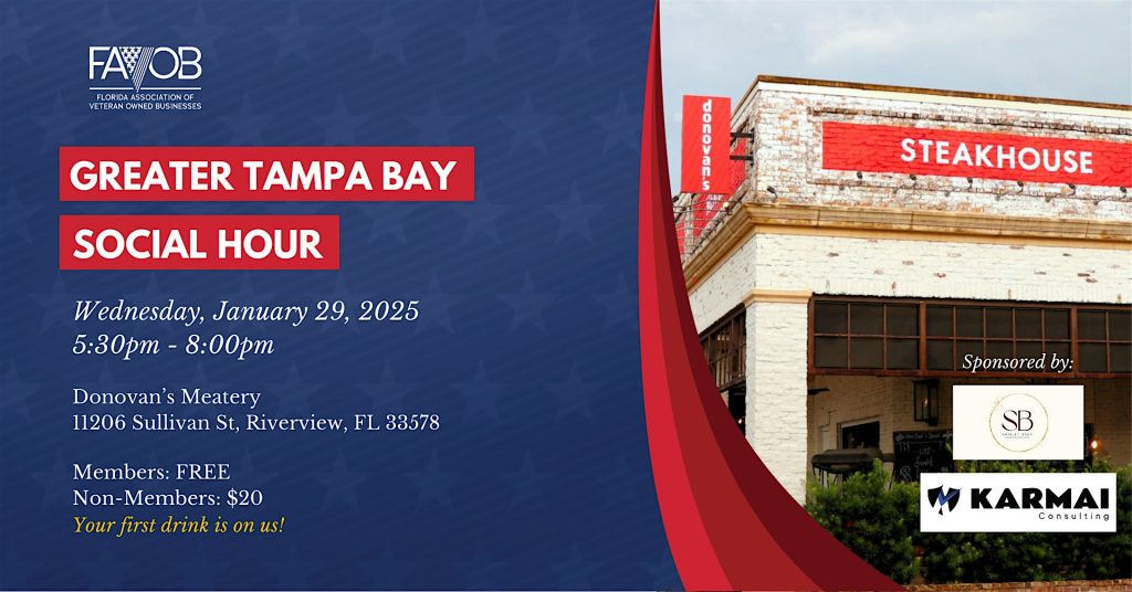 Join us for FAVOB’s Social Hour at Donovan’s Meatery on January 29, 2025, from 5:30pm-8:00pm sponsored by LeadHership Academy and Karmai Consulting.